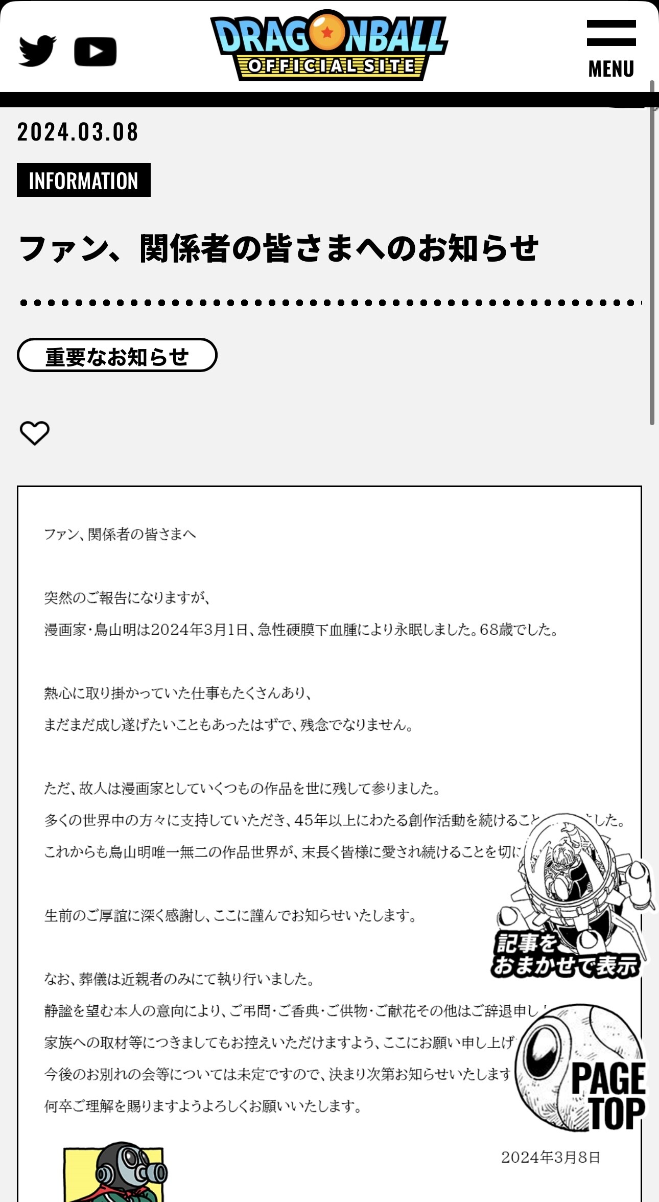 「ドラゴンボール」「Dr.スランプ」などで知られる漫画界のレジェンド鳥山明(とりやま・あきら)さんが、急性硬膜下血腫で死去したことが分かった。68歳。